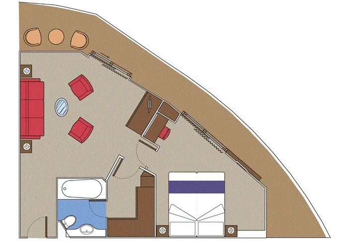 Suite s balkónom/panoramatickým oknom: cca32 m², (Royal, Family, Aurea 47-52m²) kajuta s manželskou posteľou (na požiadanie 2 oddelené postele) a rozkladacia pohovka. Klimatizácia, kúpeľňa s vaňou, toaletný stolík, priestorná skriňa, interaktívna TV, telefón, minibar, sejf, sušič na vlasy. Balkón so stolíkom a stoličkami alebo panoramatické okno. Internetové pripojenie (za poplatok).